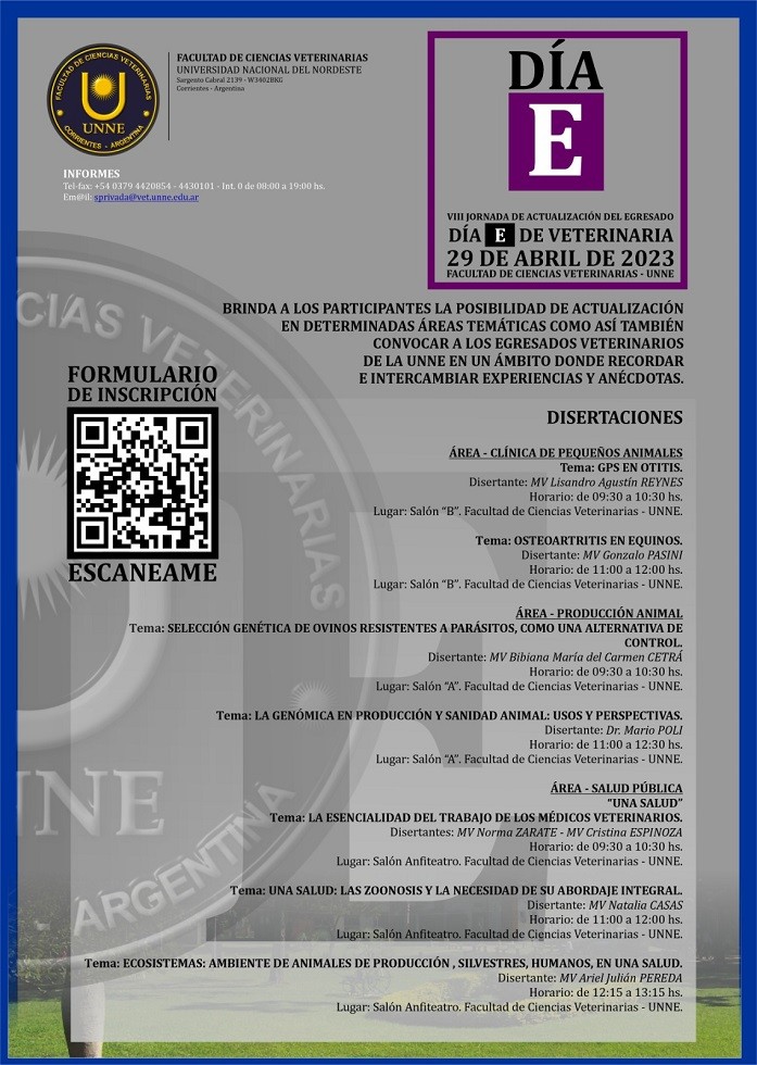 Desde la Facultad y el Centro de Egresados de Médicos Veterinario de la Universidad Nacional del Nordeste, como cada año, recuerdan a sus egresados que tienen una cita para realizar la actualización en diferentes áreas, relacionadas a las actividades profesionales de incumbencia.