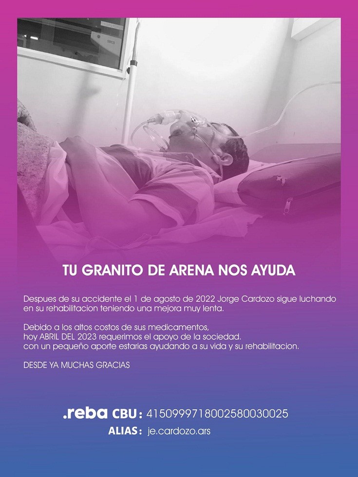 En este sentido, el Dr. Nahuel Zoiler, dio el número de la Caja de Ahorro: 4150999718002580030025. Alias: je.cardozo.ars que la familia le solicitó difundir para que la comunidad, pueda colaborar ya que por la situación que se encuentra, toda ayuda por más mínima que sea es de gran ayuda para Jorge y su familia.