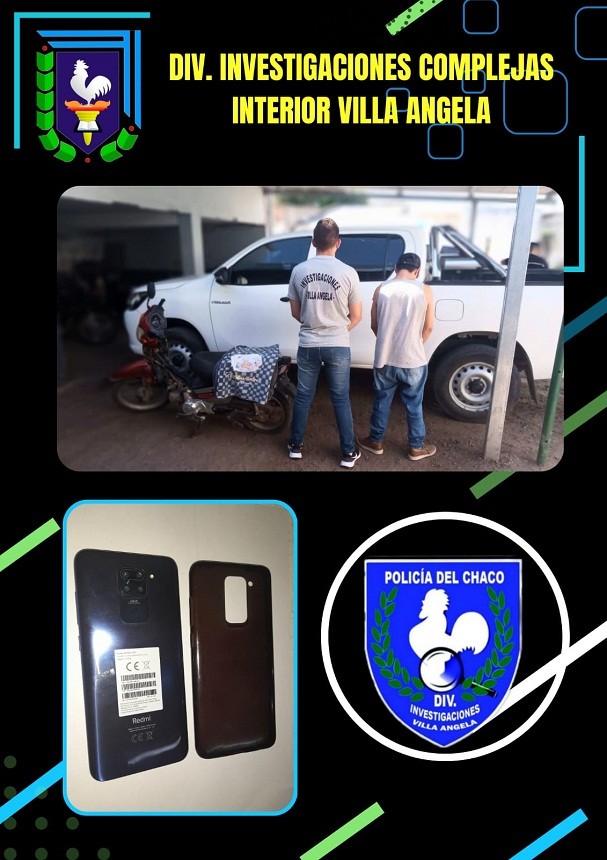 La conducción del autor identificado como G.G. C., alias “Porteño” de 40 años y el secuestro del celular XIAOMMI 9 color azul, pantalla táctil con funda color negro, junto a la motocicleta Motomel 110 c.c., se dio hoy a las 12:15 del mediodía por el personal de la División Investigaciones Complejas Interior Villa Ángela.