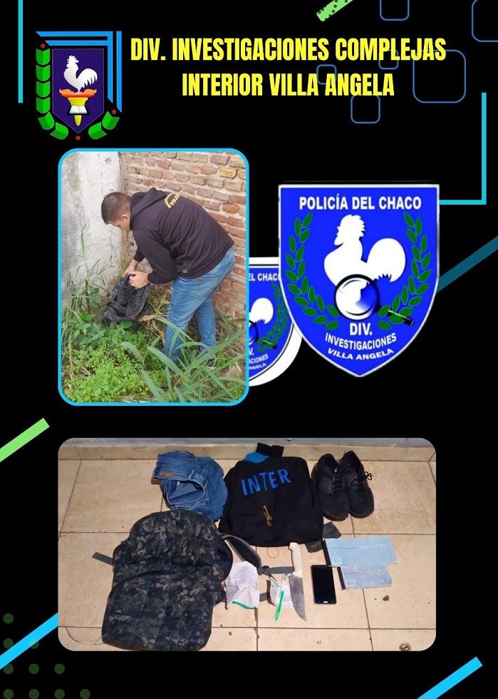 El personal de la D.I.C.I.V.A., realizó el relevamiento de la cámaras existente en inmediaciones del lugar, como así también realizó un rastrillaje, observándose oculto entre las malezas, (01) mochila verde y negro, conteniendo en su interior una campera color negro y detalles azul (equipo fútbol Inter de Milan); un par de zapatillas marca Pony color negro N° 42; un celular Samsung J7 color gris, pantalla dañada, sin chip, corroborado cuenta Gmail, corresponde con los datos del denunciante; un cuchillo tipo carnicero Stainless Steel mango color blanco; dos llaves tipo paletas; dos comprobante de pago tipo librito; un pantalón jeans color azul.