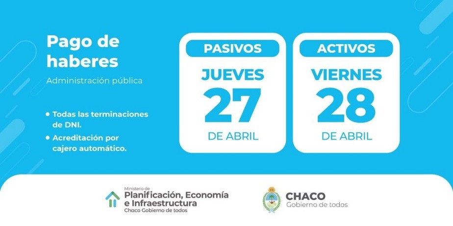 El Ministerio de Planificación, Economía e Infraestructura informó que el cronograma de pagos previsto para abril comenzará este jueves 27, con la acreditación del salario para las y los jubilados provinciales, como es habitual, antes de que finalice el mes.