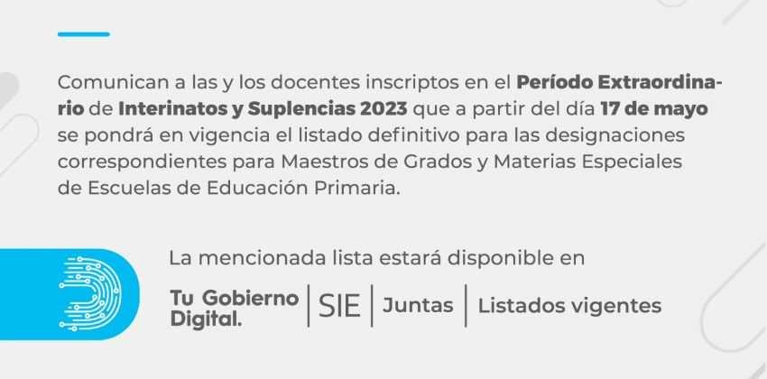 El Ministerio de Educación, a través de las Juntas de Clasificación de Nivel Primario -Regiones 1 a 10-, comunica a los y las inscriptos en el Periodo Extraordinario de Interinatos y Suplencias 2023 que, desde el 17 de mayo, está en vigencia el listado definitivo para las designaciones a Maestros de Grados y Materias Especiales de Escuelas de Educación Primaria.