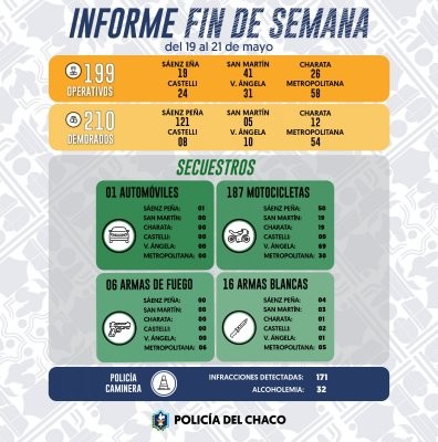 Luego de 199 operativos que se distribuyeron en toda la provincia, el personal logró secuestrar un automóvil, 187 motos (11 de ellas eran buscadas por la justicia), seis armas de fuego, 16 armas blancas y 210 personas terminaron en la comisaría.