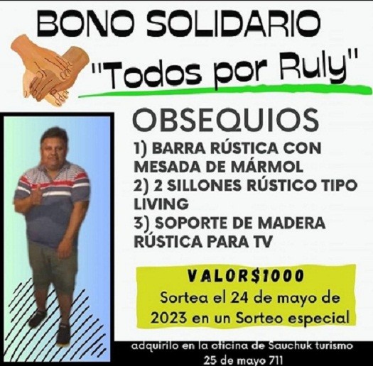 Asimismo, Ricardo Ramírez, amigo de casi toda la vida de Ruly, comentó que aún quedan algunos números a la venta y quienes los deseen adquirir lo pueden hacer comunicándose al 3644500250, en las oficinas de Sauchuk Turismo (25 de Mayo 711) o bien en la Terminal de Ómnibus en la boletería de Empresa “La Estrella” por un valor de $1.000 pesos, que hasta mañana martes 23 de mayo hay tiempo de comprar. Y se estará sorteando una barra rústica con mesada de mármol; dos sillones rústicos tipo living y un soporte de madera rústica para TV.