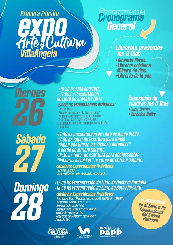 La municipalidad de Villa Ángela, a través de la Secretaria de cultura, invita a la comunidad a participar de la primera edición de la "Expo Arte y Cultura" que comienza hoy viernes 26 de mayo a partir de las 16:30 en el Centro de convenciones del Casino Platinum. La entrada es totalmente Libre y Gratuita