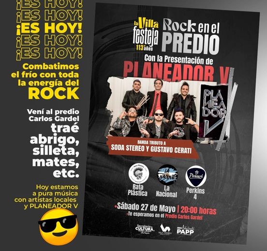 La actividad tendrá lugar este sábado 27 en el predio Carlos Gardel a partir de las 20:00 y contará con las presentaciones de "Planeador", banda musical en homenaje a Soda Stereo y Gustavo Cerati, además de "Rata Plástica", "La Nacional" y "Perkins 4".