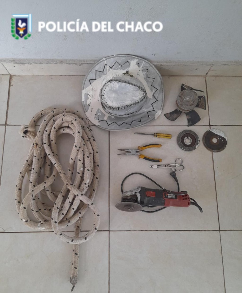 El lunes en horas de la siesta un hombre de 72 años denunció que desconocidos ingresaron a su taller y le sustrajeron 1 amoladora, 1 soga de 10 metros, herramientas varias y un sombrero. Personal de servicio externo de la comisaría local rápidamente comienza con la investigación, logrando encontrar las pertenencias denunciadas en un baldío del B° Norte.