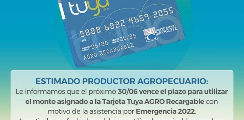 Durante la Emergencia Agropecuaria 2022, el Gobierno del Chaco dispuso fuerte una asistencia a los productores agropecuarios afectados por la sequía, programa que fue canalizado a través de Tarjeta Tuya Agro Recargable, una herramienta impulsada por el Nuevo Banco del Chaco (NBC).