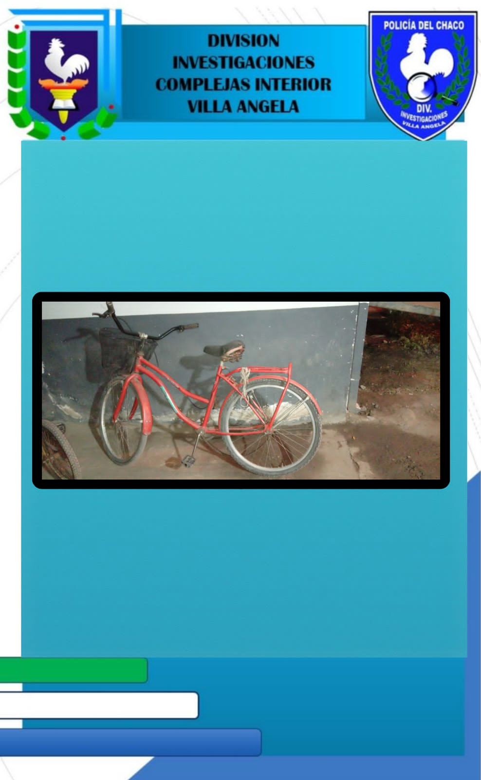 Ayer a las 19:40 horas, personal de la División Investigaciones Complejas Interior Villa Ángela, tomó conocimiento, mediante informante anónimo que en horas de la tarde por Av. Obligado, un masculino estuvo ofreciendo para la venta una bicicleta de dama, y al no poder venderla la oculto en un terreno baldío, conocido como “Quinta Martínez”, sito en Av. Obligado y calle Balcarce.