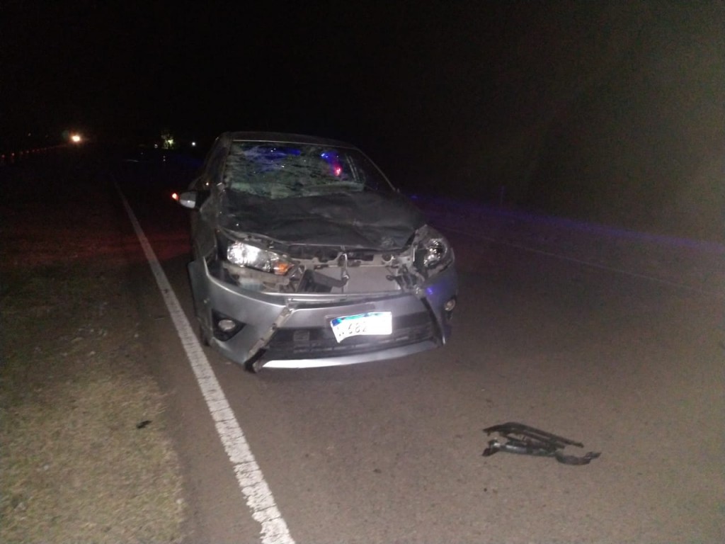 Constituida la prevención, estableció la veracidad, tratándose de un automóvil TOYOTA YARIS CVT, TIPO SEDAN 5P, COLOR GRIS, DOM. COL. "AA-682-DT", guiado por el ciudadano L. B. de 70 años, y como acompañante, a M.O.R de 76 años, quienes embistieron a un animal equino que se hallaba suelto, siendo una yegua, pelaje colorado, cabo negro, s/marca visible, encontrándose con vida a la vera de la cinta asfáltica sin sujeción.