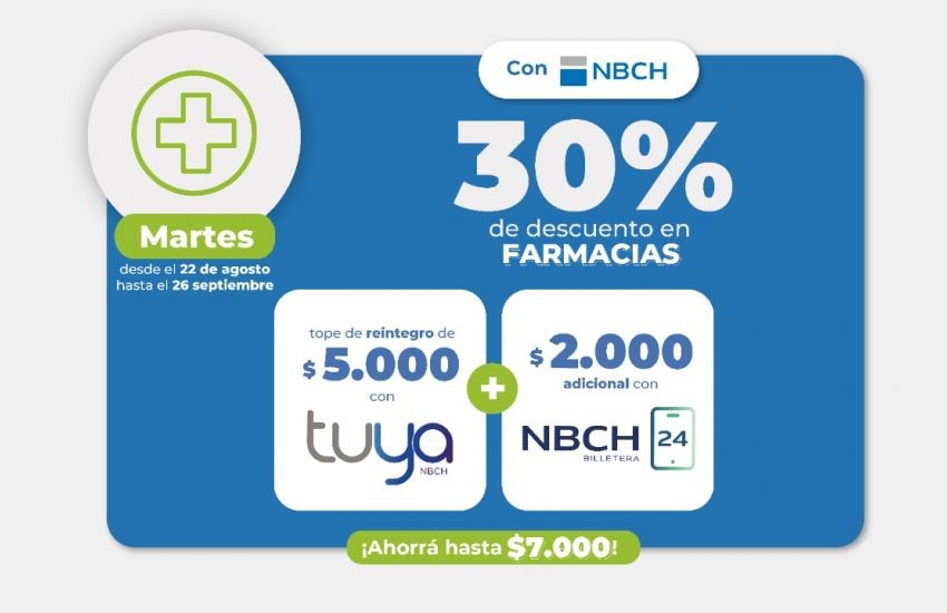 Los días martes, del 22 de agosto al 26 de septiembre, se reactivará el beneficio del 30% de descuento en farmacias (tope de reintegro de 7 mil pesos) hasta 5 mil pesos de reintegro con tarjeta TUYA y 2 mil adicional con billetera electrónica del NBCH.