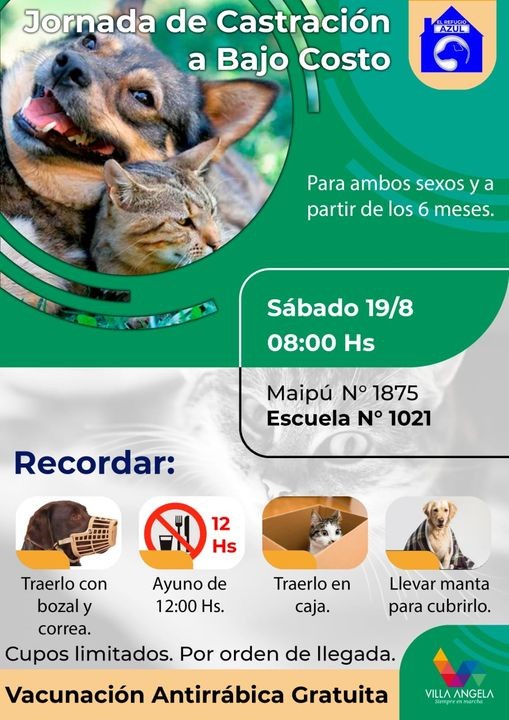 La Municipalidad de Villa Ángela acompaña al Refugio Azul en la 9° jornada de castración 2023, intervención que se realizará a bajo costo, en gatos y perros, el sábado 19 de agosto a partir de las 8:00 en la E.E.P. N° 1021 "Pedro Ortega" ubicada en Maipú 1875.