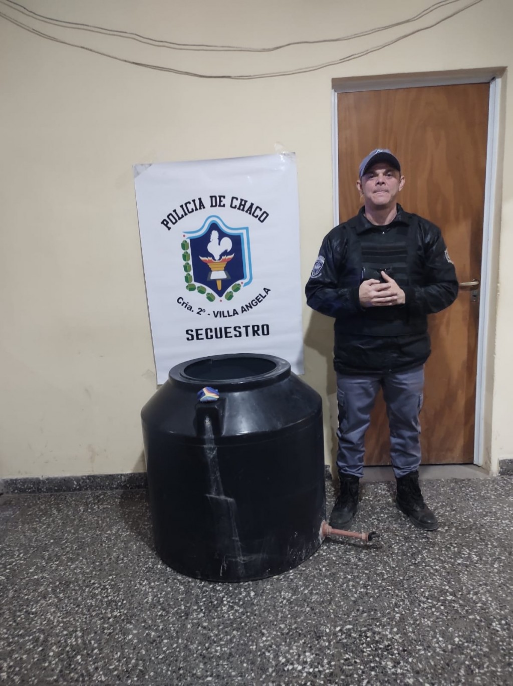 En el día de ayer, siendo las 22 horas aproximadamente, una mujer de 56 años denunció que al regresar a su casa, se da cuenta que alguien le sustrajo un tanque de agua de 500 litros fundando sospecha en su hijo de 21 años. Rápidamente el personal de la Comisaría Segunda realizó rastrillajes en cercanías del lugar del hecho, logrando hallarlo oculto en un sector de una represa.