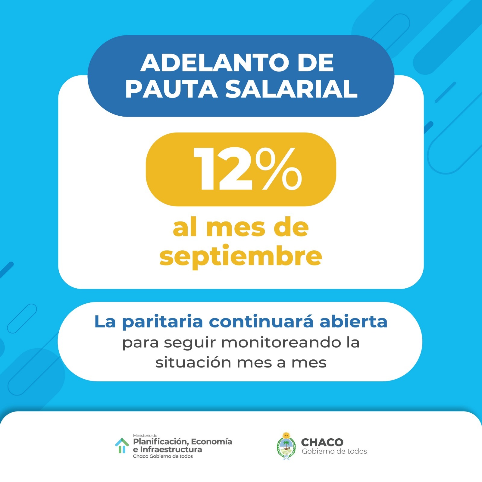 El Gobierno provincial abonar� este viernes 15 el adelanto del incremento del 12% de la pauta salarial (prevista originalmente para octubre). La medida alcanza a las y los trabajadores activos y jubilados e incluye incrementos para las becas provinciales con contraprestaci�n laboral (M�s Inclusi�n, Instituto del Deporte, Conveniados del Instituto de Cultura y Servicio y Mantenimiento escolar).