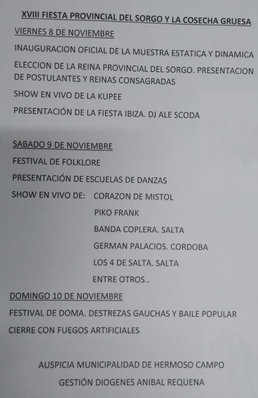 8, 9 y 10 de noviembre XVIII FIESTA PROVINCIAL DEL SORGO Y LA COSECHA GRUESA EN HERMOSO CAMPO