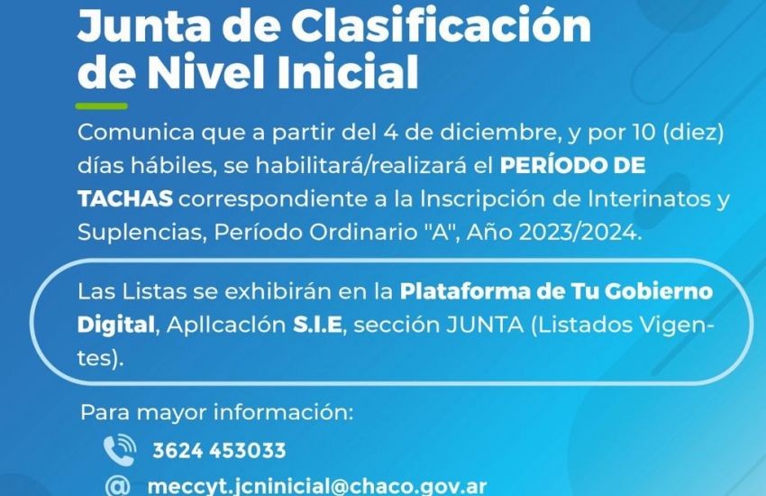 El Ministerio de Educación del Chaco, a través de la Junta de Clasificación de Nivel Inicial, comunica que a partir del 4 de diciembre, y por el término de 10 días hábiles, se realizará el período de tachas correspondiente a la lnscripción de lnterinatos y Suplencias, Período Ordinario "A", Año 2023/2024.