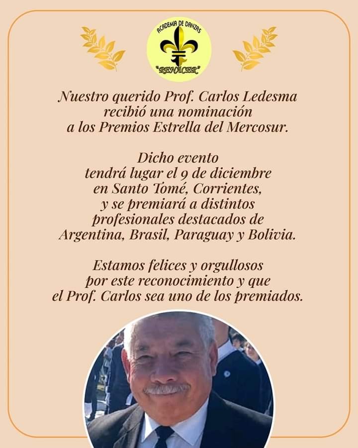 Feliz por la nominación de la entrega de premios “Estrella del Mercosur” organizada por la Confederación Interamericana de Danzas (CIAT), el Profesor Carlos Ledesma, informó sobre la invitación para recibir el próximo 9 de diciembre en Santo Tomé, Corrientes, este premio que tanto lo llena de orgullo.