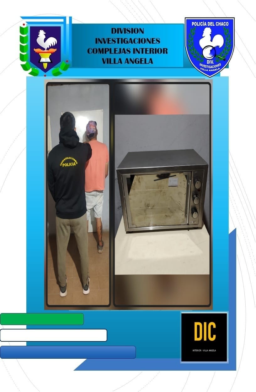 Personal de la División de Investigaciones trabajando en un hecho delictivo ocurrido días atrás, que damnifica una mujer de 61 años, donde desconocidos le sutrajeron un dispenser, una garrafa de 10 kg, una cafetera, una máquina para cortar cabellos y una planchita, de lo cual se logró recuperar el dispenser y la garrafa, como así también la aprehensión de uno de los supuestos autores. En esta oportunidad los agentes continuando con la línea investigativa lograron recuperar el horno eléctrico y la localización del segundo autor del hecho, un masculino de 35 años que conforman la magistratura interviniente fue notificado de su aprehensión en la presente causa, continuandose con la investigación para poder dar con el resto de los bienes.