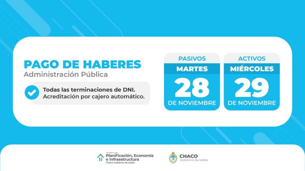 En tanto, este martes 28, el gobierno abona salarios a las y los jubilados provinciales cuando, a partir de las 21, sus haberes estén disponibles en los cajeros automáticos del Nuevo Banco del Chaco. Un día después, podrán cobrar por ventanilla en las sucursales habilitadas por la entidad crediticia.