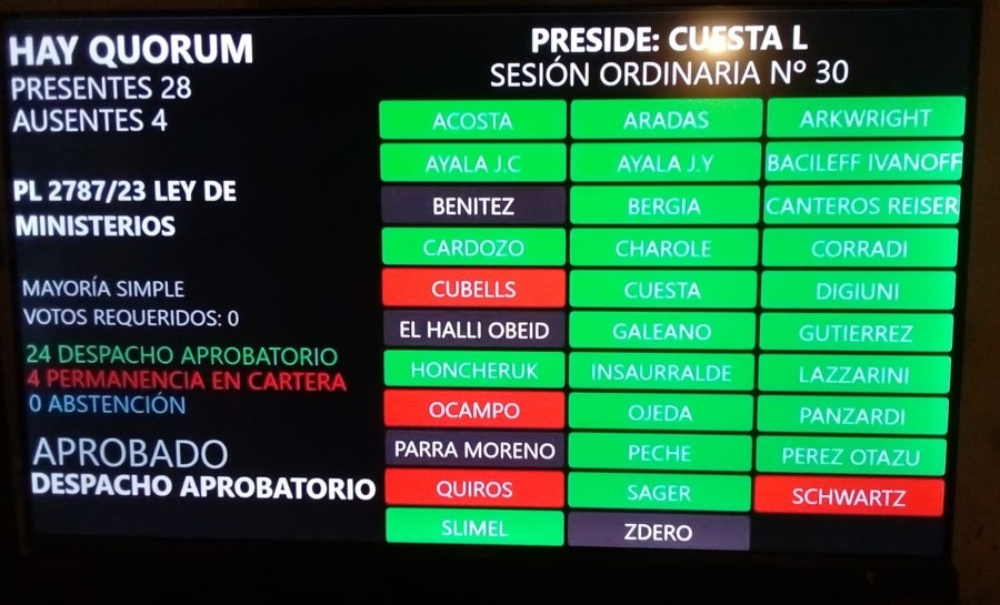 Con 24 votos a favor y cuatro por su permanencia en cartera, se aprobó este miércoles la ley de Ministerios que le otorga la estructura con la que funcionará el Ejecutivo provincial desde que asuma el próximo gobernador Leandro Zdero. El diputado Livio Gutiérrez llevó tranquilidad a los trabajadores de planta de la administración pública provincial durante el debate parlamentario. Por parte de quienes asumirán el rol de opositores a partir del 10 de diciembre, hubo fuertes cuestionamientos: "No vamos a dar ni un solo paso atrás en los derechos conquistados", asumieron.