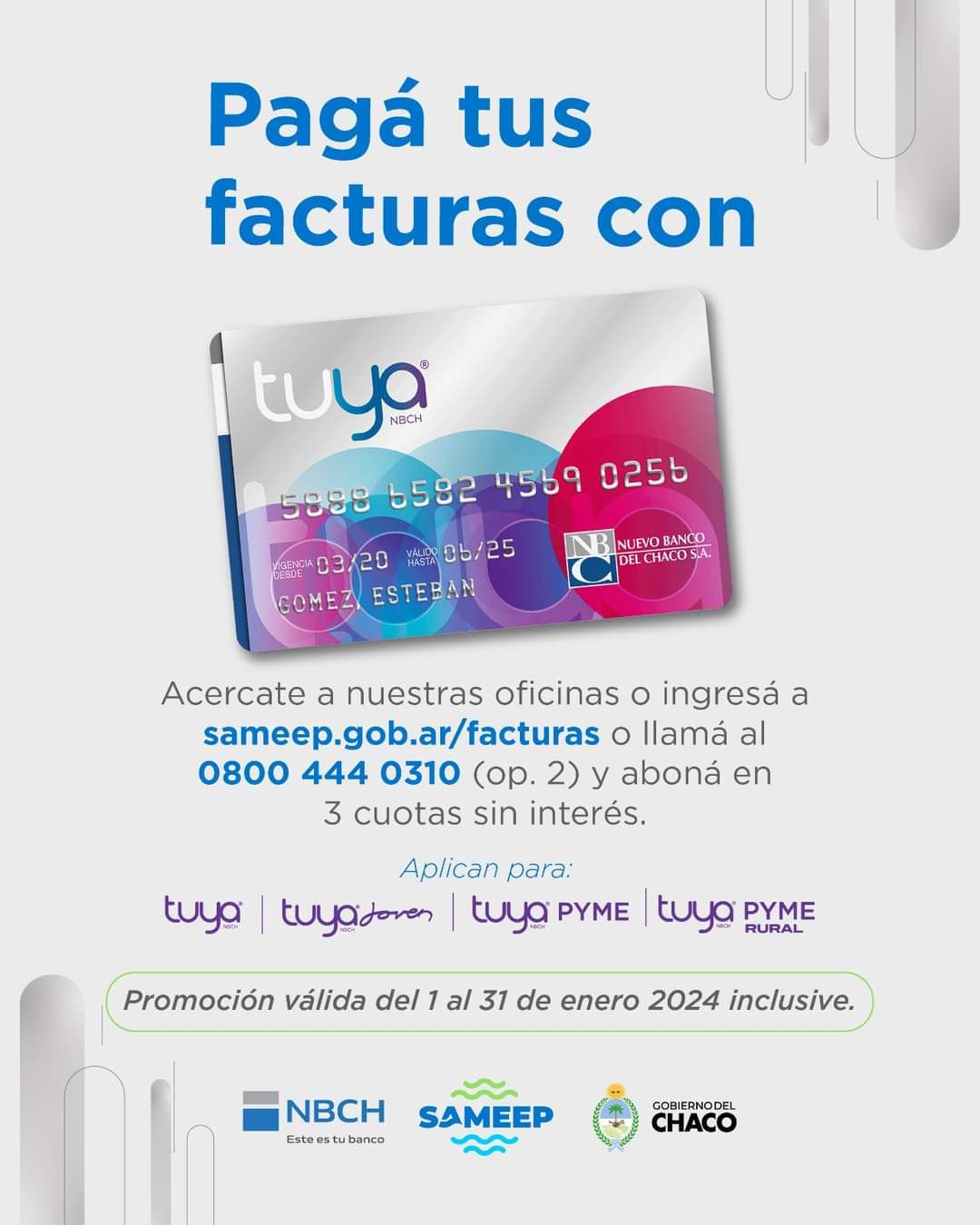 Desde la empresa se recuerda a los usuarios que continúa vigente la promoción de pago de facturas en cuotas sin interés a través de la tarjeta Tuya del Nuevo Banco del Chaco y Naranja hasta el 31 de enero.
