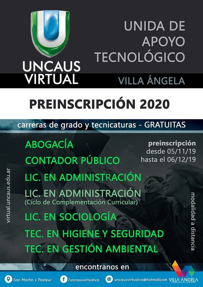 Desde la municipalidad de Villa Ángela y a través de Punto Digital de la ciudad, indicaron que se encuentra abierta la inscripción 2020 para las carreras de la UNCAUS Virtual Villa Ángela desde el 05 de noviembre al 06 de diciembre de 2019 en la dirección: San Martín y Pasteur. Las carreras que se brindan de forma gratuita en convenio con UNCAUS en modalidad Virtual son: Abogacía, Contador Público, Lic. en Administración, Lic. en Sociología, Tec. en Higiene y Seguridad, Tec. en Gestión Ambiental.
