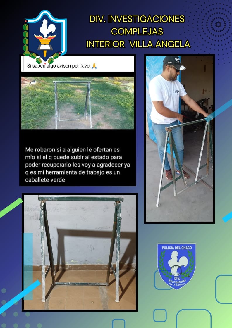 Personal de la División Investigaciones Complejas Interior Villa Ángela, tomó conocimiento de que un sujeto, había comercializado dicho efecto. Teniendo en cuenta dicha información, se constituyeron en el lugar y a través de averiguaciones, se logró el recupero el caballete y se procedió al formal secuestro bajo acta respectiva.