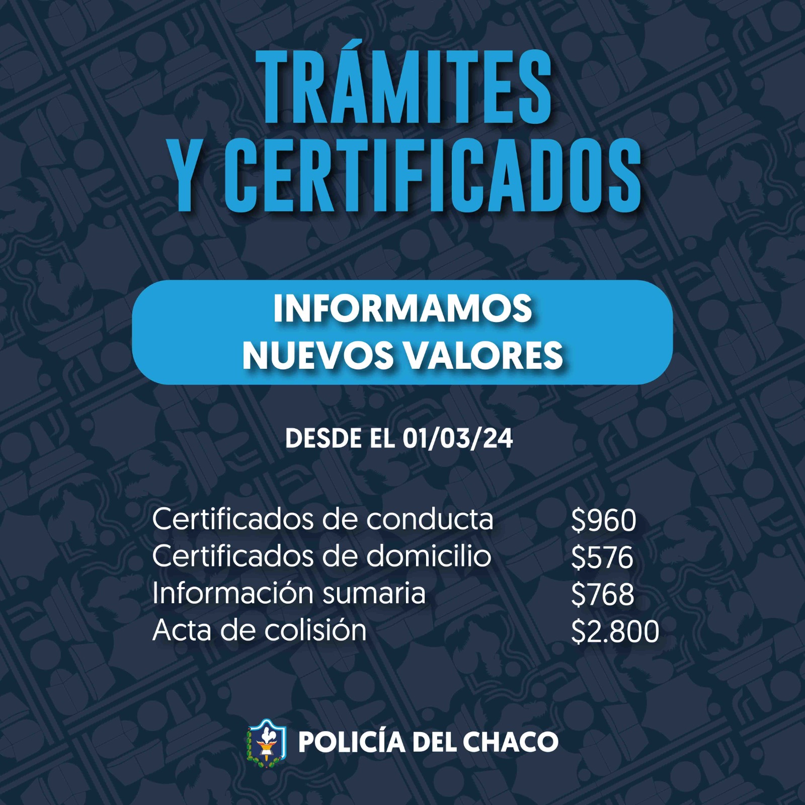 Los nuevos precios serán: Certificado de Conducta: $960 Certificado de Domicilio: $576 Información Sumaria: $768 Acta por Colisión: $2.880 Además, los nuevos montos ya vigentes para certificados de Reincidencia Nacional son: 5 días: $1000 24 horas $2400 6 horas: $4800 (Para que la respuesta esté disponible en este lapso de tiempo, debe realizarse antes de las 12:00hs del mediodía) Express 1hs.: $8500