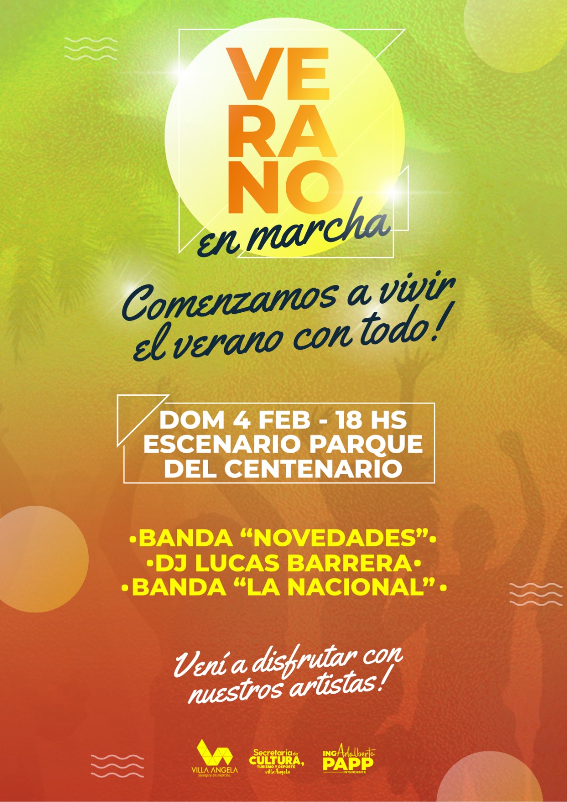 Allí destacó el esfuerzo del equipo de gobierno por brindar actividades diferentes a la comunidad y adelantó que el domingo 4 de febrero se iniciará el programa cultural "Verano en Marcha" a partir de las 19 horas en el escenario del Parque del Centenario. Allí, artistas locales brindarán su música en un evento de Rock Pank, con la presentación de las bandas locales "Novedades" y "La Nacional", y también se contará con la participación del DJ Lukas Barrera que estará animando esta tarde.