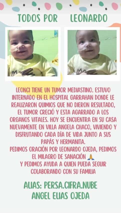 “Nosotros estamos aquí en Villa Ángela, hace aproximadamente un mes que nos dieron el alta porque el tumor de él, ya no tiene cura. Las quimios no dieron el resultado que se esperaba y en vez de achicar el tumor, hizo crecer el doble tomando órganos vitales. Por lo que los doctores decidieron que continué en casa con cuidado paliativos”, explicó Cintia. Al tiempo que comentó que “hoy Leonci, amaneció y estuvo muy molesto, no sabemos si es por su tumor o porque también, le están saliendo sus dientecitos”.
