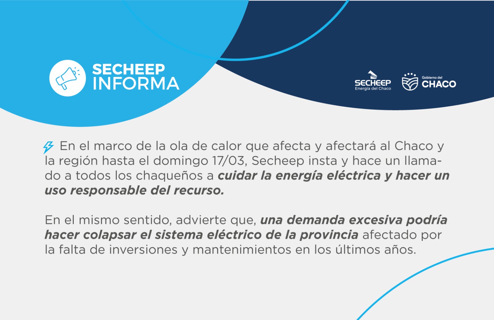 En el marco de la ola de calor que azota al Chaco y la región, SECHEEP insta y hace un llamado a todos los chaqueños a cuidar la energía eléctrica y hacer un uso responsable del recurso