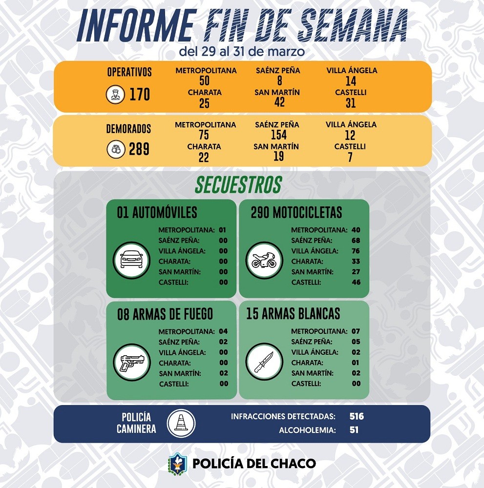 Por su parte, en la zona de Presidencia Roque Sáenz Peña se incautaron 68 motocicletas, cinco armas blancas y dos armas de fuego. Hubo 154 demorados con un total de 8 operativos.