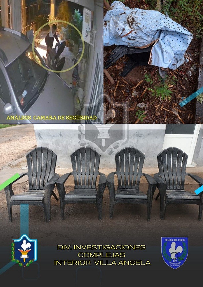 Tras arduas tareas investigativas, personal de la División Investigaciones Villa Ángela, logró recuperar cuatros sillones negros que fueron sustraídos de la galería de un domicilio previo escalar la reja perimetral. Los cuales fueron abandonados en un terreno baldío y tapados con una bolsa de nylon.