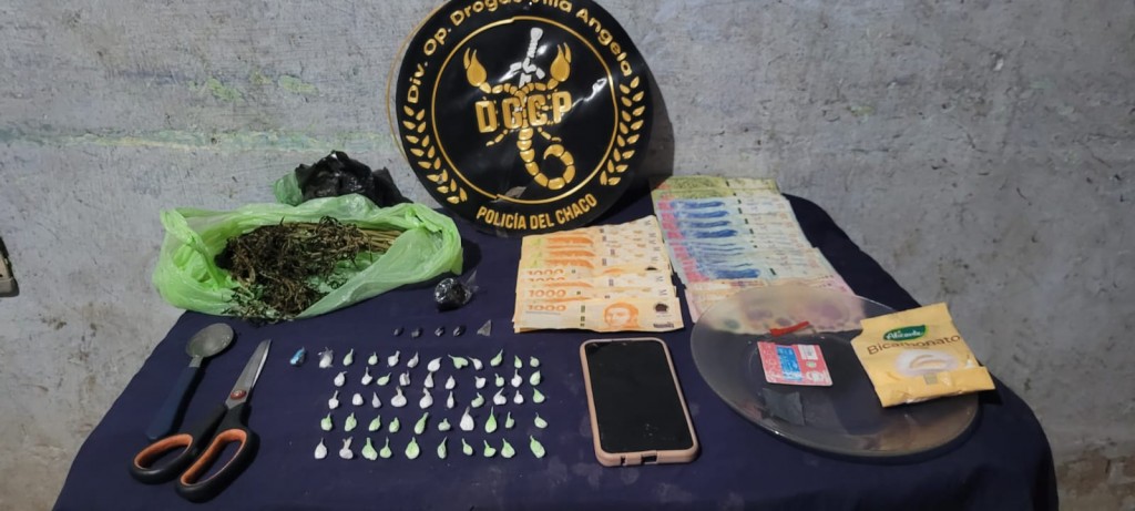 Efectivo de la División Operaciones Drogas interior, realizo un allanamiento este martes en un domicilio del barrio 120 viviendas, obteniendo como resultado el secuestro de 57 envoltorios de cocaína de un peso total de 16, 08 gramos, 24, 36 gramos de marihuana, un teléfono celular, $15.100 pesos en efectivo, tijeras, platos y demás elementos de interés en la causa.