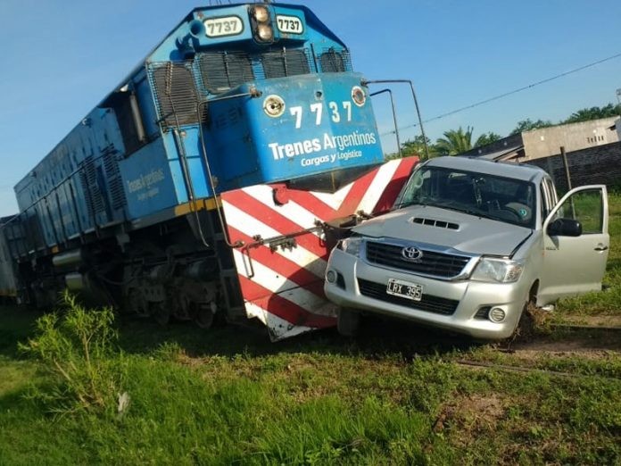 Según informó la policía, el siniestro vial se produjo pasadas las 7.30. Por motivos que aún no se dieron a conocer, la Toyota Hilux atravesó el paso a nivel justo en el momento que cruzaba el tren y este se lo llevó puesta.