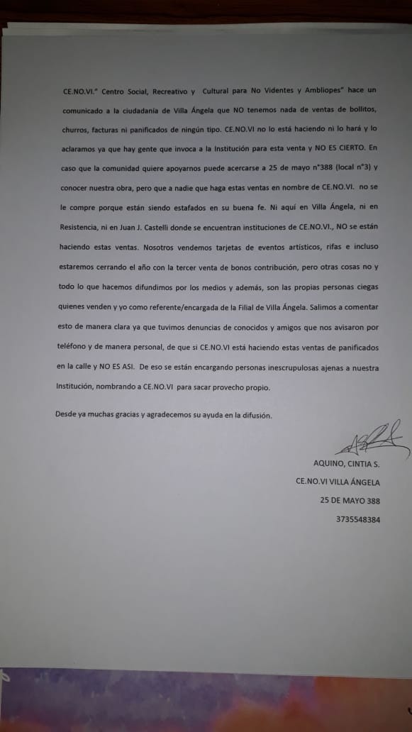 En comunicación con la representante del Ce.No.Vi, de la ciudad de Villa Ángela, Cintia Aquino, expresa que al tener conocimiento de que personas inescrupulosas están realizando venta de facturs, churros, bollitos y otros, en nombre de la Institución.