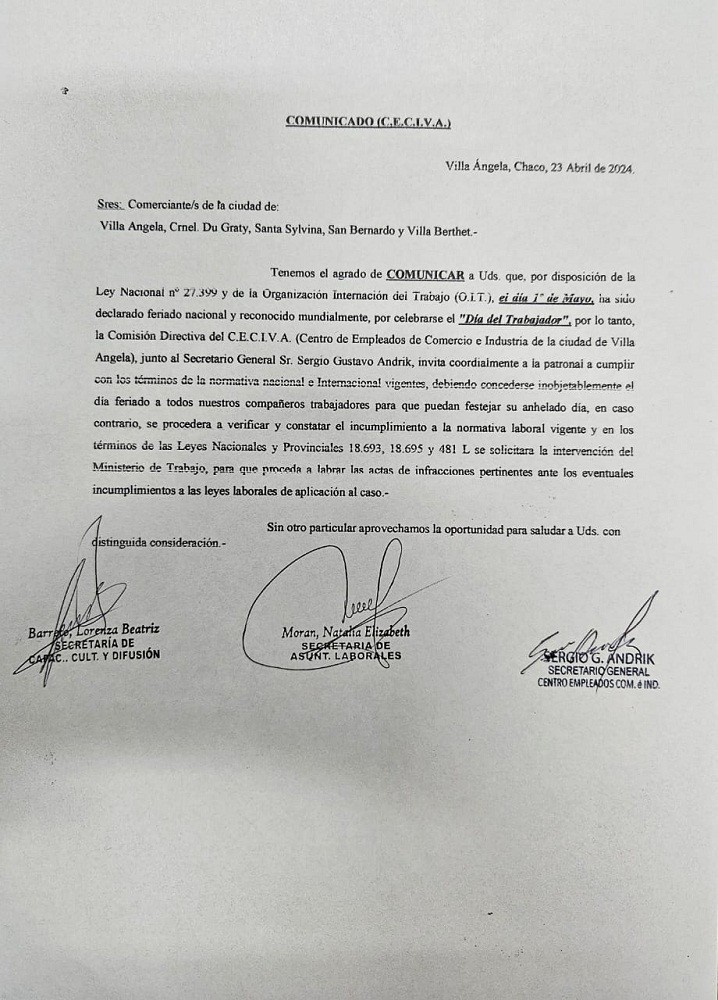 “A través de una nota y como desde el 2019 que asumimos, está nuevamente acordado que el día 1 de mayo va ser día no laborable, a todos aquellos empresarios que tienen empleados en relación de dependencia. Si pueden abrir, siempre y cuando sea atendido por su propio dueño o su familia y siempre cuando, en las inspecciones que hacemos no se detecten que hay empleados con relación de dependencia o empleados no registrados porque ahí se elabora las actas correspondientes y el Ministerio es quien determina las multas”, explicó.