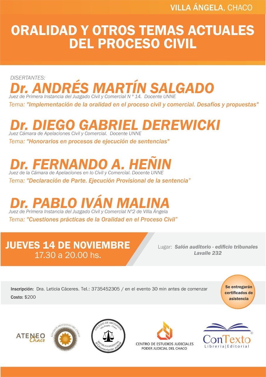 VILLA ÁNGELA: "CHARLA DE ORALIDAD Y OTROS TEMAS ACTUALES DEL PROCESO CIVIL".