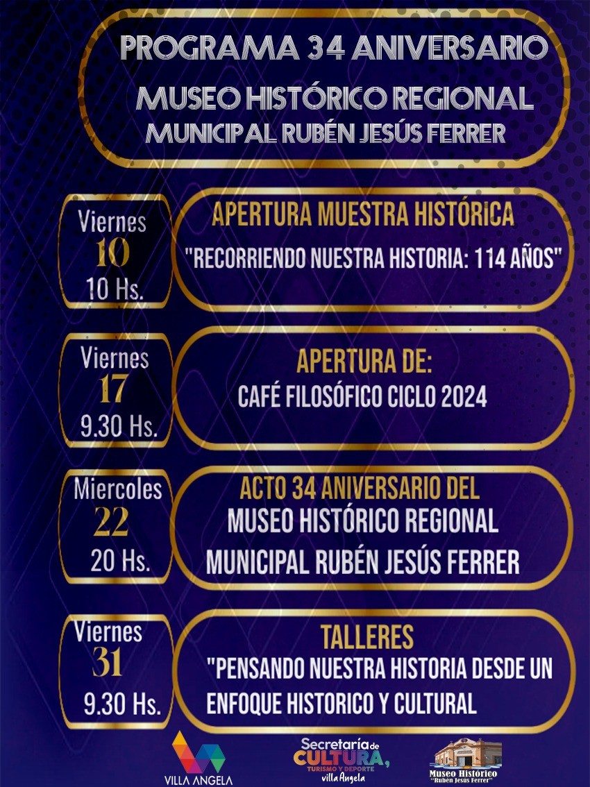 Villa Ángela: AGENDA DE ACTIVIDADES DEL 34º ANIVERSARIO DEL MUSEO HISTORICO REGIONAL MUNICIPAL “RUBÉN JESÚS FERRER”