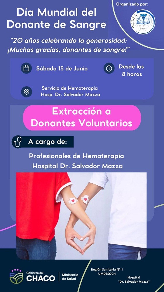 Villa Ángela: DÍA MUNDIAL DEL DONANTE DE SANGRE | El sábado 15 se estará realizando una jornada de extracción de sangre a donantes voluntarios