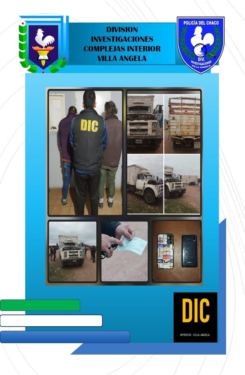 Luego de montar un operativo, el personal de la División Investigaciones Villa Ángela, procedió a la detención de (2) masculino, B. J. A. (64) y P. E. D. (38), ambos con domicilio en nuestra ciudad, teniendo en su poder este último un cheque apócrifo (trucho) por un monto de $690.000,00 mil pesos, se procedió al formal secuestro como así también de un camión color blanco con el cual realizaban el transporte. Además, se secuestro -01- teléfono celular, marca Samsung Galaxy A14, color verde y -01- teléfono celular, marca Noblez, color negro.