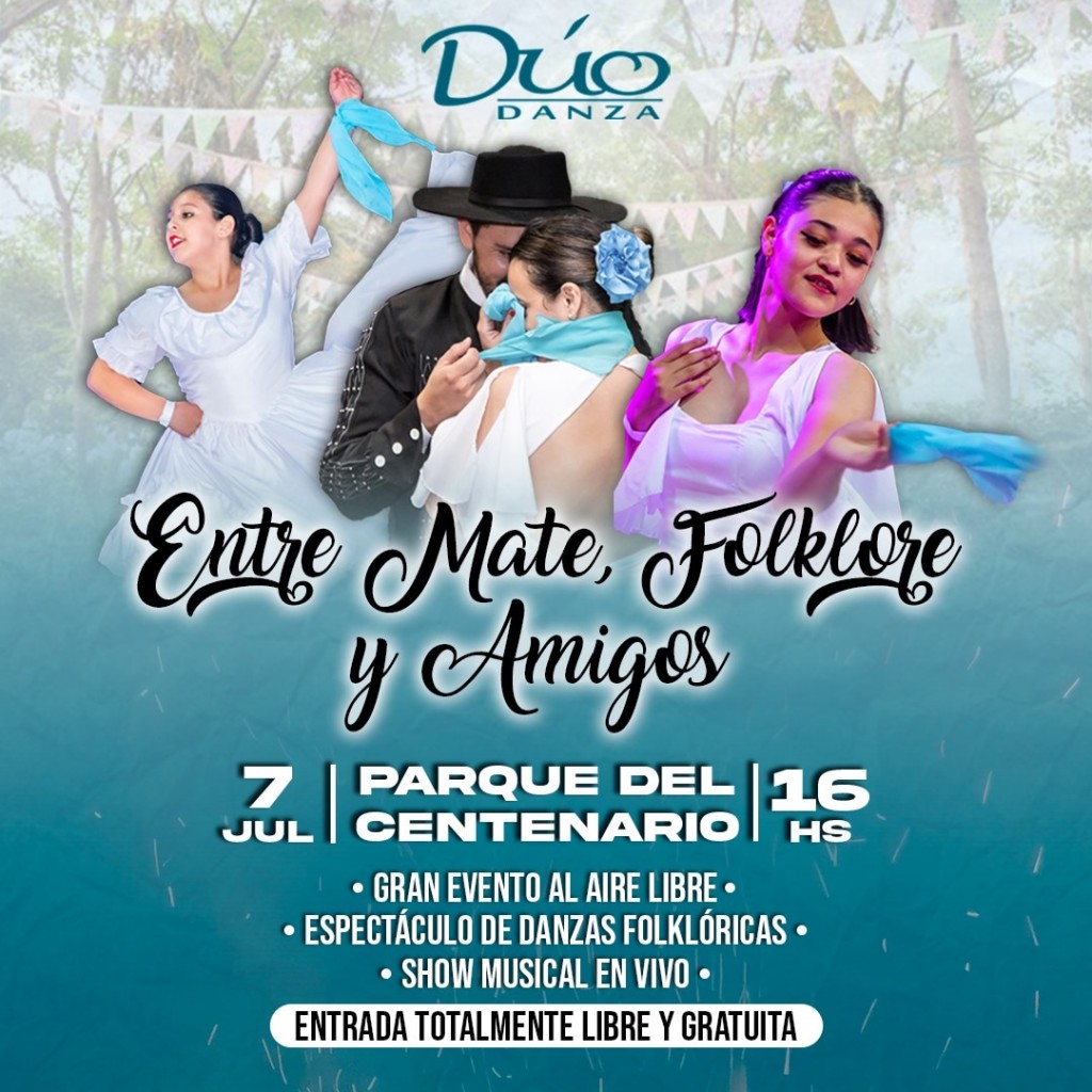 En el marco de la celebración por los 13 años de trayectoria de la escuela Dúo Danzas, de la profesora, Valeria Sosa, en comunicación con #LaMañanaDeManantial, invitó a toda la comunidad a su gran evento al aire libre “Entre mate, folklore y amigos”. El cual tendrá lugar este domingo 7 de julio desde las 15:30 horas en el Parque del Centenario con entrada libre y gratuita.