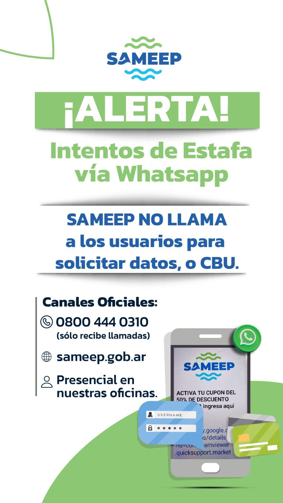 La problemática surge, a raíz de la denuncia de un usuario, quien informó que recibió un whatsapp desde un número desconocido, solicitándole los datos de su cuenta del Banco Nación para recibir un supuesto subsidio tarifario. Vale aclarar que desde Sameep no se llama a ningún usuario telefónicamente, sin excepción. La línea 0800 - 444 - 0310 es sólo para atender reclamos de agua y cloacas.