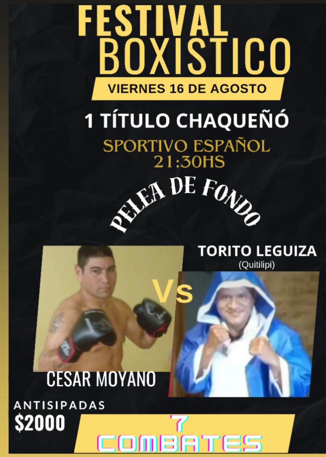 Mario Su�rez explic� que "habr� 7 peleas, una de mujer entre Maira Benavides de Villa �ngela vs Olga "la peque" Gonz�lez de Coronel Du Graty. Despu�s, por el t�tulo juvenil chaque�o pelean Miguel "Junior" Mart�nez de Villa �ngela vs Nicol�s S�nchez de Castelli y la de fondo revancha que pelearon el mes pasado C�sar Moyano de Villa �ngela vs "Torito" Leguiza de Quitilipi" mencion� Su�rez.