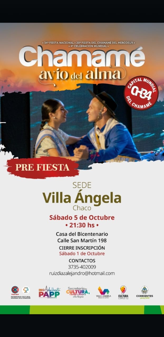 La Municipalidad de Villa Ángela invita a los artistas locales a participar de la Pre Fiesta del Chamamé, que tendrá lugar el próximo 5 de octubre a partir de las 21:00 horas. Este evento se ha convertido en una tradición en la ciudad.
