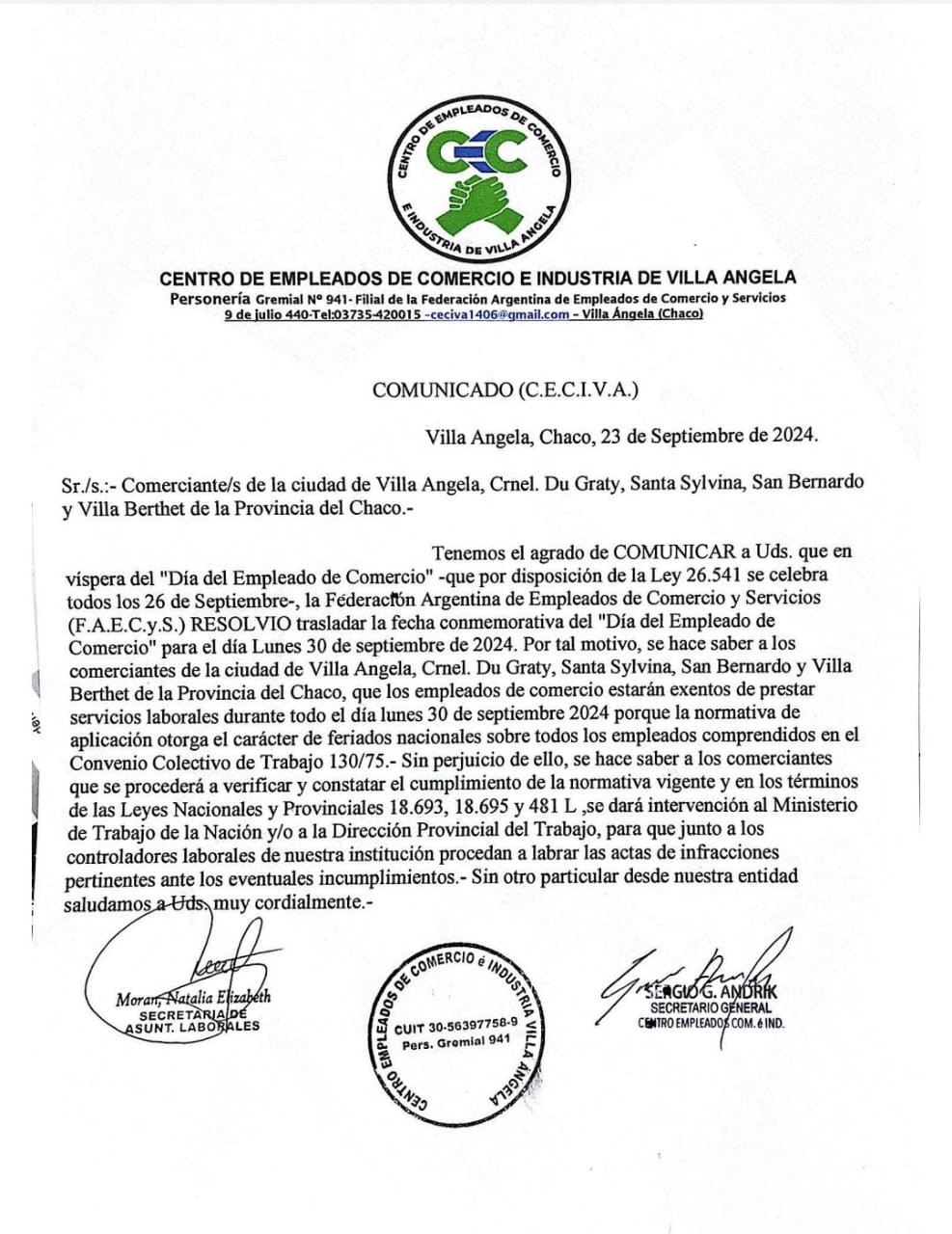 Villa Ángela: DÍA NO LABORAL EL 30 DE SEPTIEMBRE PARA LOS EMPLEADOS DE COMERCIO
