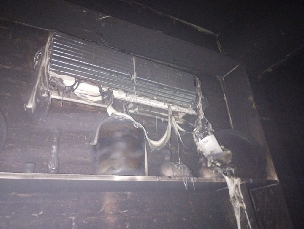 El personal concurrente procedió a verificar el control total del siniestro, la remoción del material afectado y tomas fotográficas a los fines de elaborar el informe pericial. Donde se constató, el daño total en un (01) sillón de madera, un (01) acondicionador de aire tipo Split, (02) ventiladores de techo, (01) smart TV 43", instalación eléctrica, daño sectorizado en pared y techo, así como el tiznamiento generalizado.