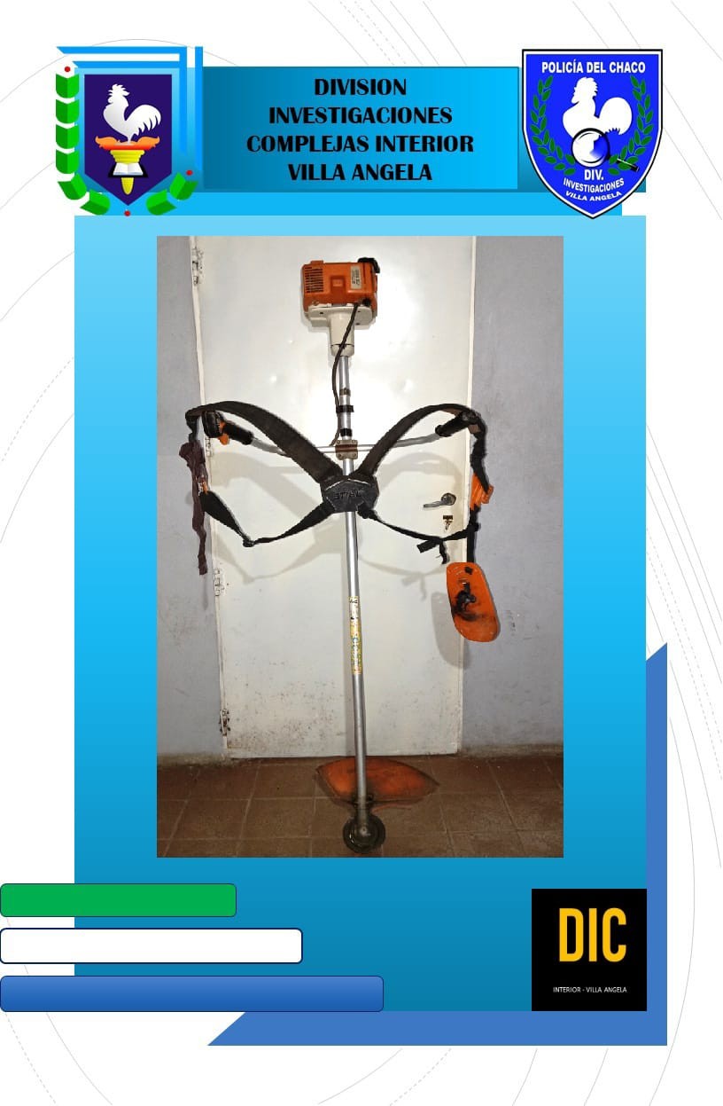 Ayer en horas de la tarde y tras abocados a las tareas investigativas para dar con una máquina de cortar pasto marca Sthil color naranja modelo FS160 con pechera y un lavarropa semiautomático marca Codini, color blanco. Los mismo, previo ejercer violencia fueron sustraídos de una vivienda ubicada por calle Quebracho S/N, el pasado domingo 20 de octubre.
