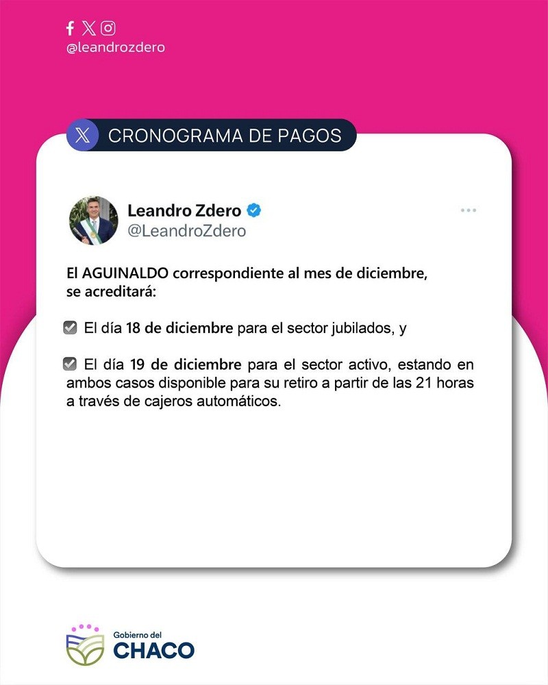 El gobernador Leandro Zdero, anunció este miércoles, las fechas de pago del aguinaldo para los Jubilados y los empleados Activos provinciales.