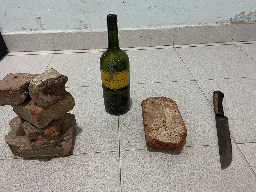 En el lugar de los hechos, se procedió al secuestro de un cuchillo tipo carnicero, una botella de vidrio y cuatro trozos de ladrillo con los cuales acometió contra empleados policiales.